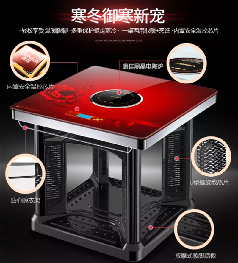 產品介紹:八大配置,居家安Quan、放心,用心制造,為每個家庭做出更多改變,電取暖桌的主要八大人性化設計:1、舒適按摩、溫暖腳底座2、五檔可控、溫度隨心調3、簡易LED、狀態一目了然4、智能恒溫、溫度安全穩定5、四維升溫、溫暖全家人6、童鎖設計、預防兒童燙傷7、觸控……